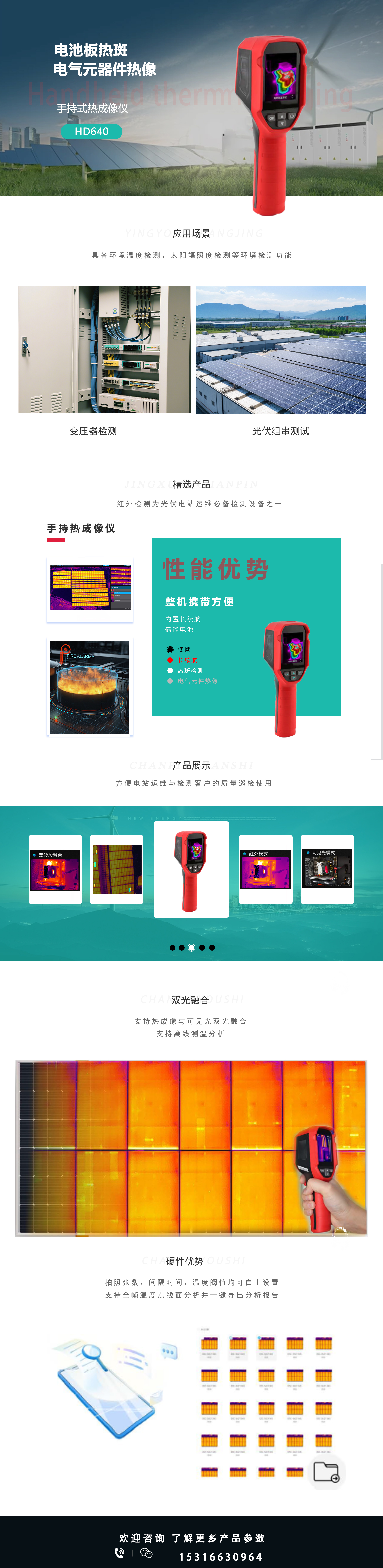 手持热成像仪 HD640 应用于光伏太阳能电池板热斑热点检测,具备简易快速便携的特点 HD640具备256~640分辨率的高像素,可通过远程APP操控设备在线检测与实时监控的能力,同时可通过4G无线传输至云平台可通过电脑PC软件进行热成像的分析处理工作。