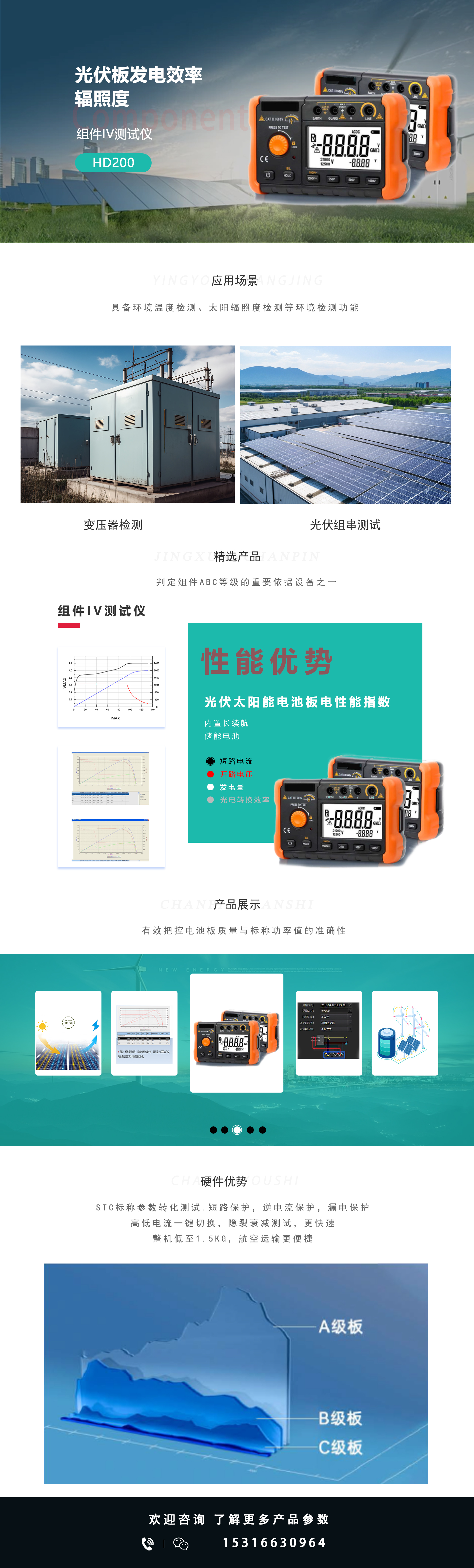 便携式IV测试仪HD200 可精准测试光伏太阳能电池板电性能指数,包括短路电流、开路电压、发电量、最大功率值、IV曲线、光电转换效率、辐照度数据采集等