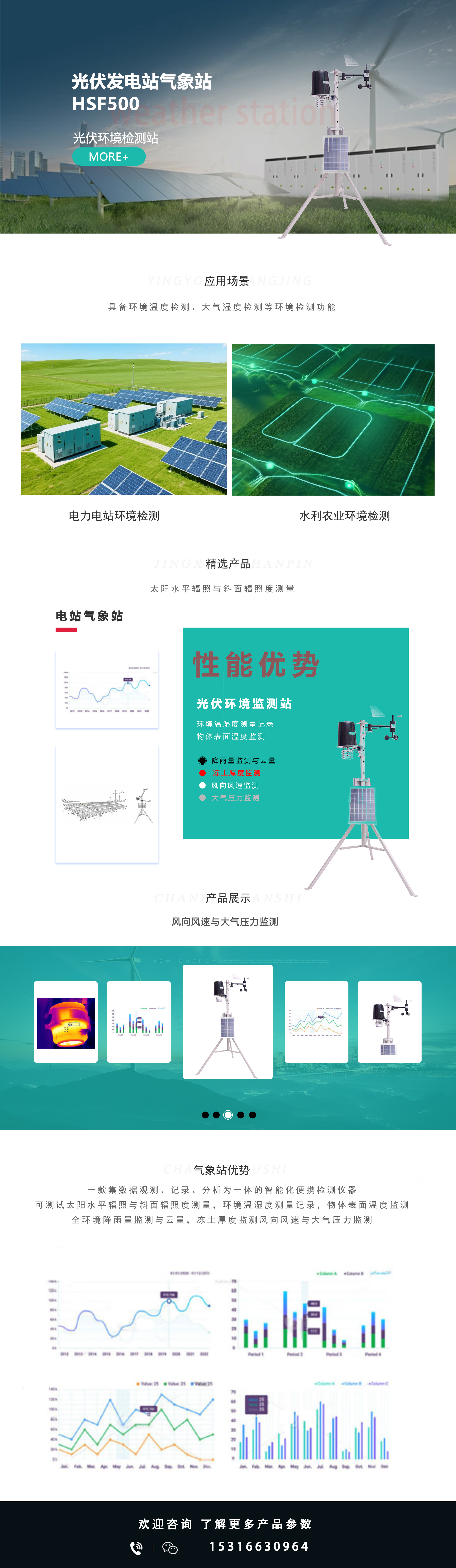 本款产品是专业针对光伏发电站研发生产的环境监测系统,该设备采用新型一体化结构设计,测量精度高,使用方便,可采集1-13要素:含太阳辐射(水平/斜面)、温度、湿度、风速、风向、大气压力、雨量、背板温度等要素,要素可按需定制。